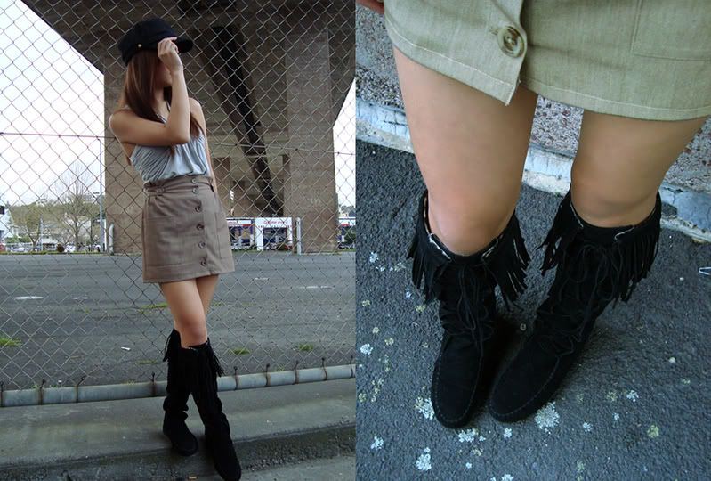 Not much of an interesting outfit today, just thought I'd debut my new boots, which I have so wisely purchased at the end of winter. They're a takeoff of the Minnetonka moccasin style of course. I seem to be really into fringe right now... hmmm I sense a pair of fringe sandals sneaking their way into my wardrobe very soon.